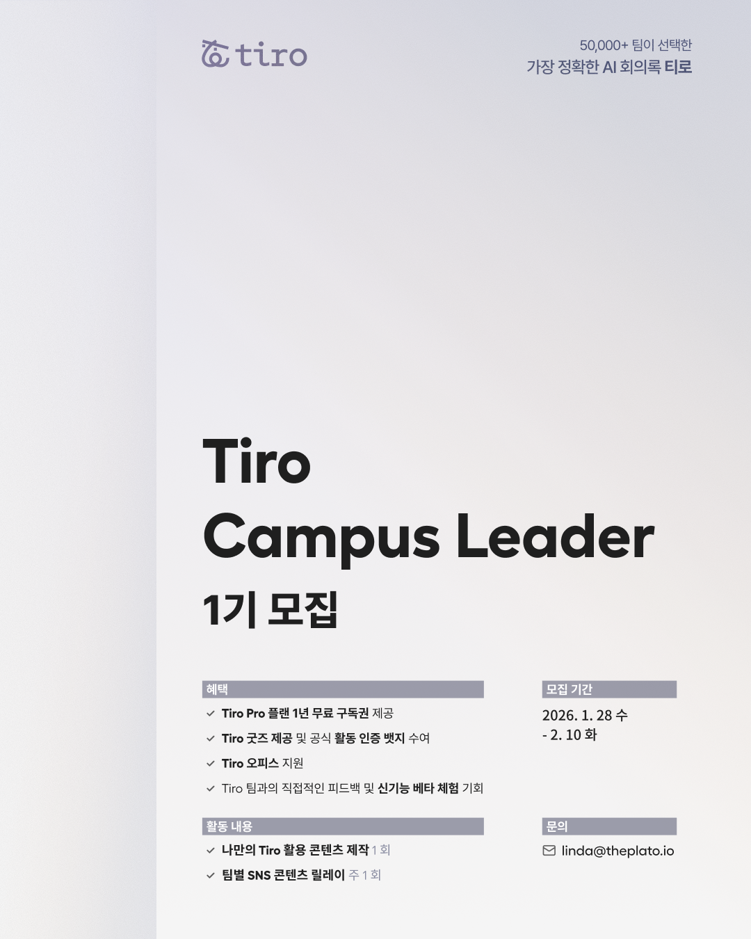 가장 빠르게 성장하는 AI 노트테이커, Tiro(티로)와 함께할 첫 번째 캠퍼스 리더를 찾습니다.
